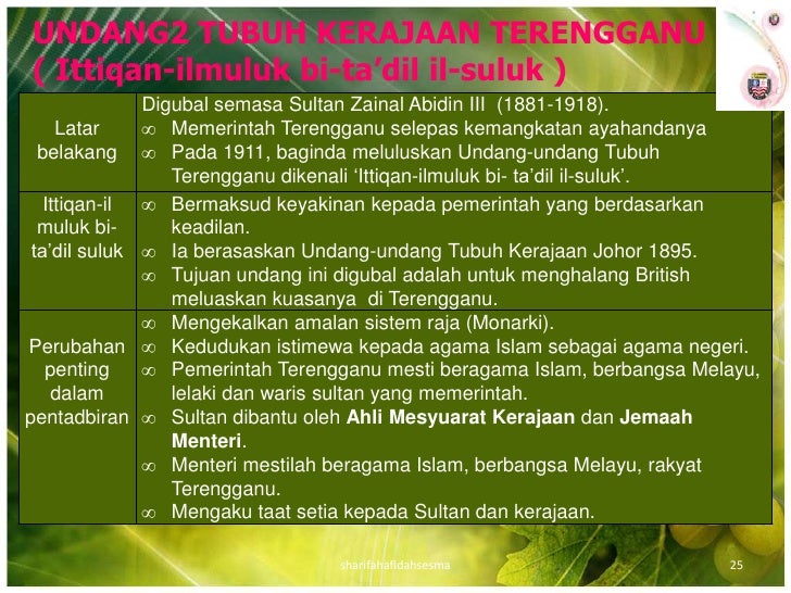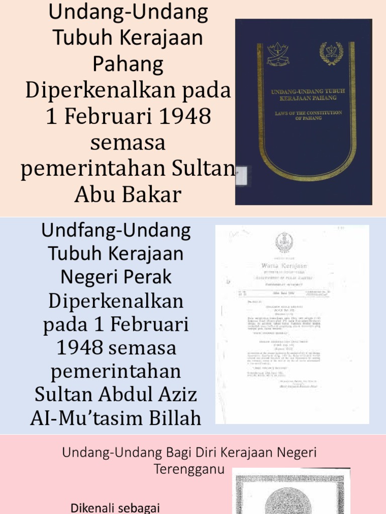 Assalam alaik saya sedang mencari manuskrip undang undang tubuh negeri pahang yang bertarikh 1948 untuk tujuan penyelidikan. Dewan negeri pahang bersidang sebanyak tiga kali setahun. Undang undang tubuh kerajaan pahang pancapersada blogspot wednesday october 6 2010 bab 1 raja pemerintah raja pemerintah raja pemerintah dan waris waris negeri yang akan menggantikannya hendaklah melayu daripada darah raja dan hendaklah beragama islam keturunan sultan haji ahmad shah. Bertanggungjawab dalam semua urusan yang berkaitan dengan kebawah duli yang maha mulia sultan pahang sama ada urusan rasmi atau tidak rasmi bersesuaian dengan kedudukan baginda sebagai sultan dan raja pemerintah negeri pahang dan jajahan takluknya yang memerintah mengikut undang undang tubuh kerajaan pahang.
